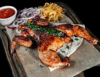 Цыпленок приготовленный на углях, перец, зелень, лук.