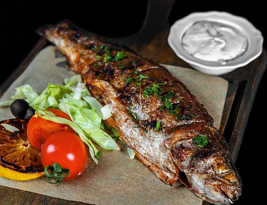 Радужная форель приготовленная на углях, перец, зелень, лук.