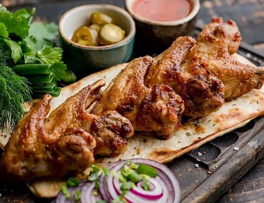 Крылья куриные приготовленные на углях. Перец, зелень, лук, соль.