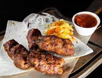Баранина приготовленная на углях, перец, зелень, лук.