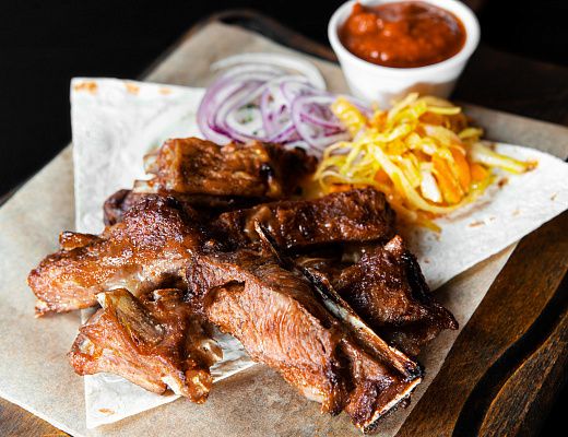Баранина на кости приготовленная на углях, перец, зелень, лук.