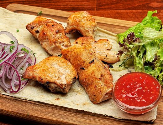 Филе бедра цыпленка приготовленное на углях, перец, зелень, лук.