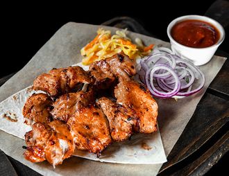 Филе индейки приготовленная на углях, перец, зелень, лук.