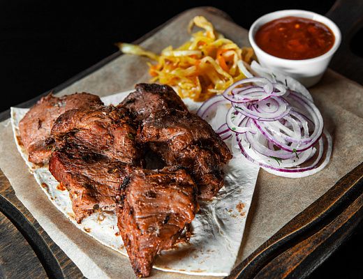 Телятина приготовленная на углях, перец, зелень, лук.