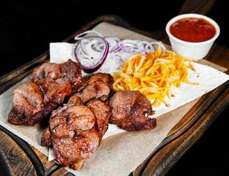 Баранина приготовленная на углях, перец, зелень, лук.