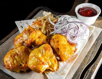 Куриное филе приготовленное на углях, перец, соль, зелень, лук.