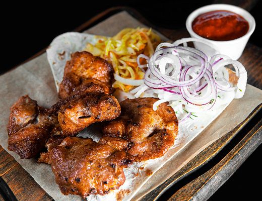 Свинная шея приготовленная на углях, перец, зелень, лук.